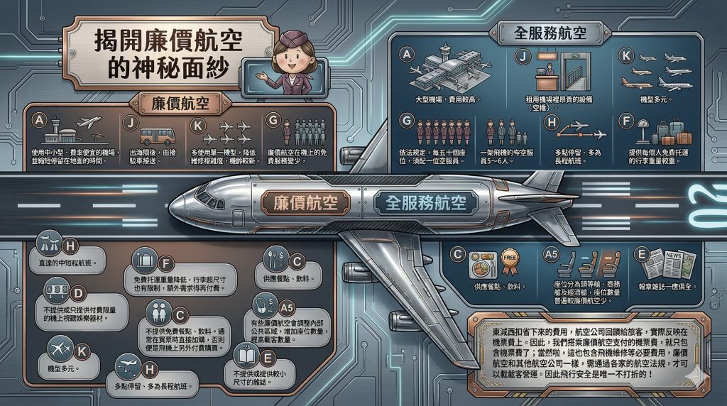 我們常講的「廉價航空」,其實正式名稱是 LCC(Low-Cost Carrie,低成本航空)。像早期的亞洲航空、近期的台灣虎航、樂桃航空這類都屬於LCC。這類空公司的營運邏輯其實很簡單,她把所有東西拆開賣,像行李要加價、選位要加價、餐點要加價等,同時搭乘時的航廈、航班時間等等,都會是最離峰的時段。