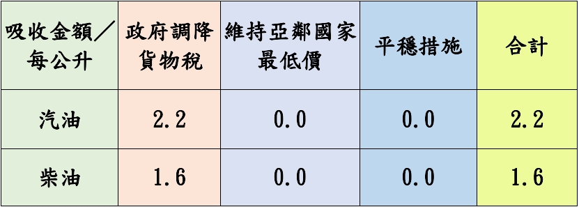 按浮動油價機制調整原則,汽、柴油價格每公升應各調降0.2元,已低於亞洲鄰近國家(日、韓、港、星)。吸收金額如附表。