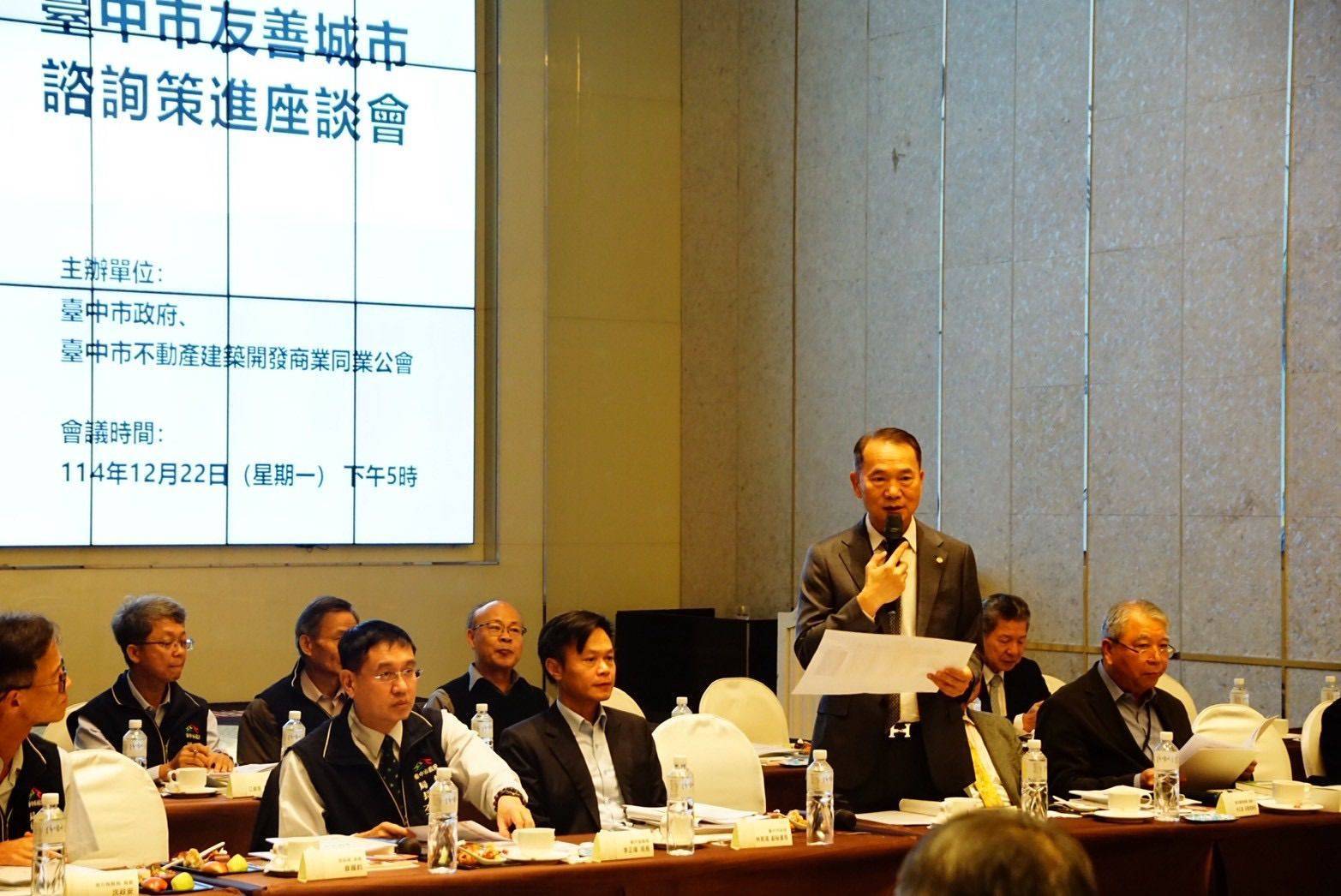 台中市政府昨(22)日攜手台中市不動產建築開發商業同業公會,共同舉辦「114年台中市友善城市諮詢策進座談會」,由市府副秘書長林育鴻代表市長盧秀燕,率領市府團隊與產業界代表進行面對面交流,廣納各界建言,深化公私協力。
