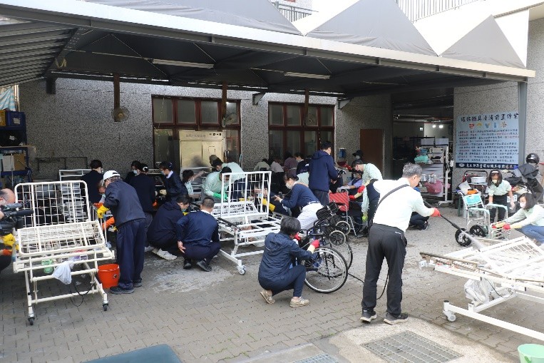 ▲台中慈濟醫院30位醫護同仁及家屬31日化身清消志工到「慈濟東大輔具平台」,捲袖清洗輪椅、搬運病床,用汗水體悟病人出院後居家照護的真實需求,實踐「醫人醫病更醫心」的理念。(圖╱台中慈濟醫院提供)