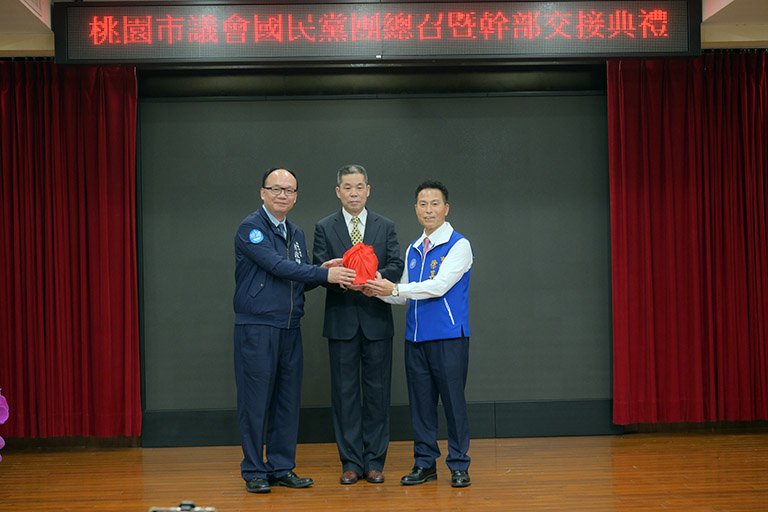 ▲交接由國民黨桃園市黨部主委蔡忠誠監交(圖中),新任總召由徐其萬議員(圖右)接任。(圖/記者范文濱攝)