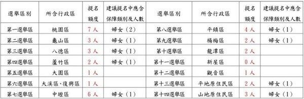 國民黨桃園市議員各選舉區提名席次如下: