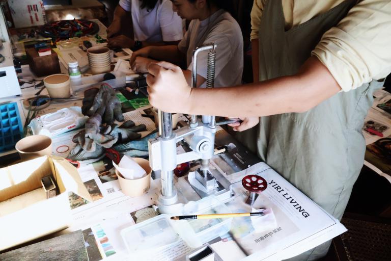 兒藝基地也與隆中向上教育基金會合作,在互動體驗空間推出「SOGA STOP!」插畫展與永續主題繪本閱讀,透過圖像與故事引導孩子認識生活中的永續行動,完成任務學習單還可獲得小禮物;永續系列活動最後一環「禮物循環站:木箱再製工作坊」,邀請親子拆解「遊色場」作品使用過的木箱,重新打磨與裝飾,轉化為書櫃、矮桌或板凳等生活家具,讓展覽材料以新的形式延續使用,將永續理念帶入日常生活,一起實踐永續發展。