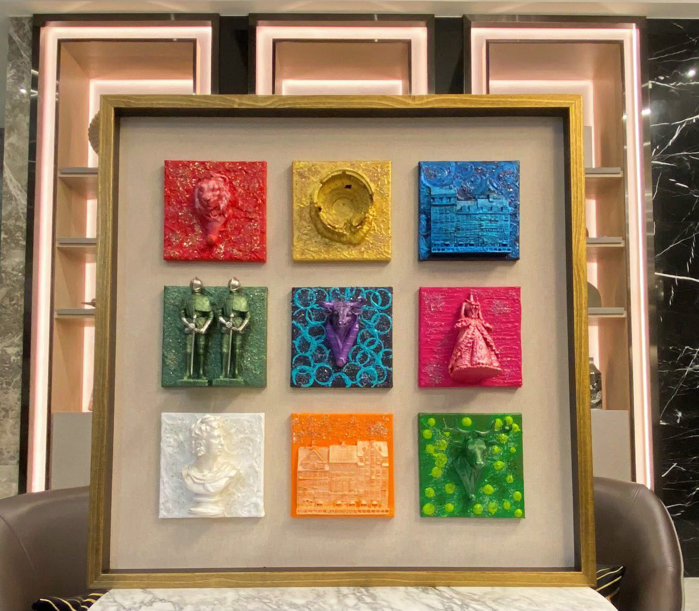 上圖-每一匹馬來自各國城市,創意理念:走在世界每個角落,藝術家環遊86個國家350座城市,這次作品結合歐盟國家當地元素/媒材/飾品/水晶/寶石/首飾/項鏈/胸針/等配件構圖,華麗璀璨優雅,這個系列主角以(馬)(馬車)為主題,揮灑創意自由,利用不同媒材組合,純手工精湛創作,打造獨一無二限量作品,將城市中好幾世紀底蘊,情感,美好能量展現在作品中,有一種生活叫(慢溫),高端媒材融合,製造生活中的驚喜,用嶄新樣貌訴說好幾世紀的故事,就地取材創作之旅,讓夢想照進了現實,精緻品味而動人,細節豐富,顏色絢麗燦爛。