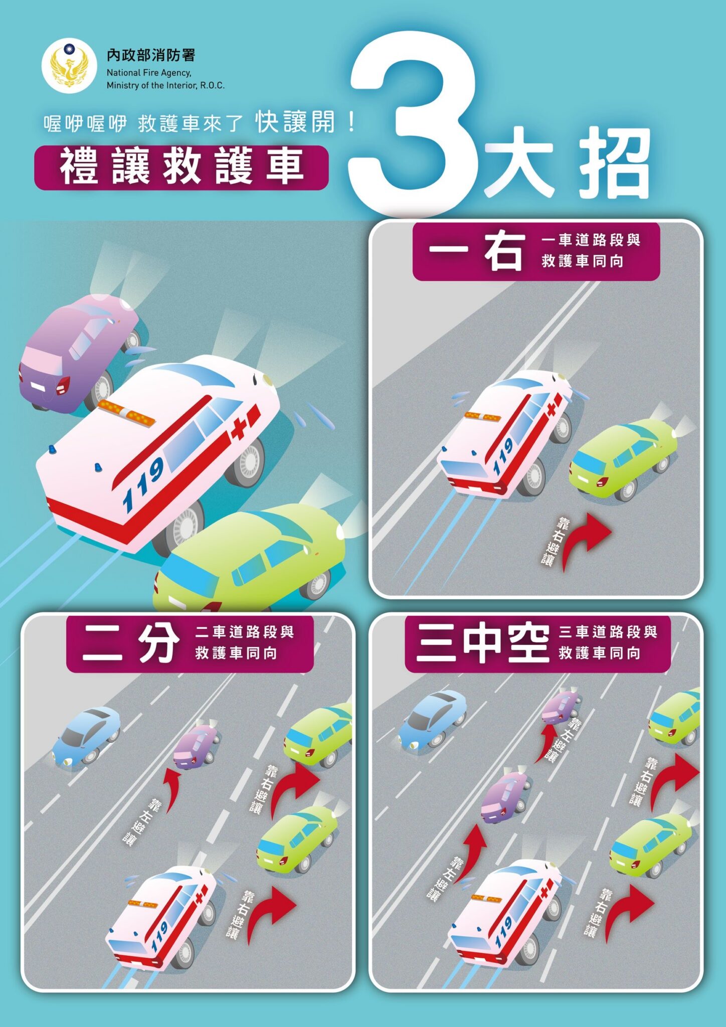 消防局呼籲,用路人在道路行駛時,當聽到救護車鳴笛急行,表示有傷病患正急需要救護資源,請用路人立即配合禮讓,以爭取寶貴的救命時間。禮讓救護車有三大原則,「一右、二分、三中空」,亦即靠右行駛、路口停讓、車道中央保持淨空,避免因為搶快、遲疑或違規行為影響救護車輛通行。