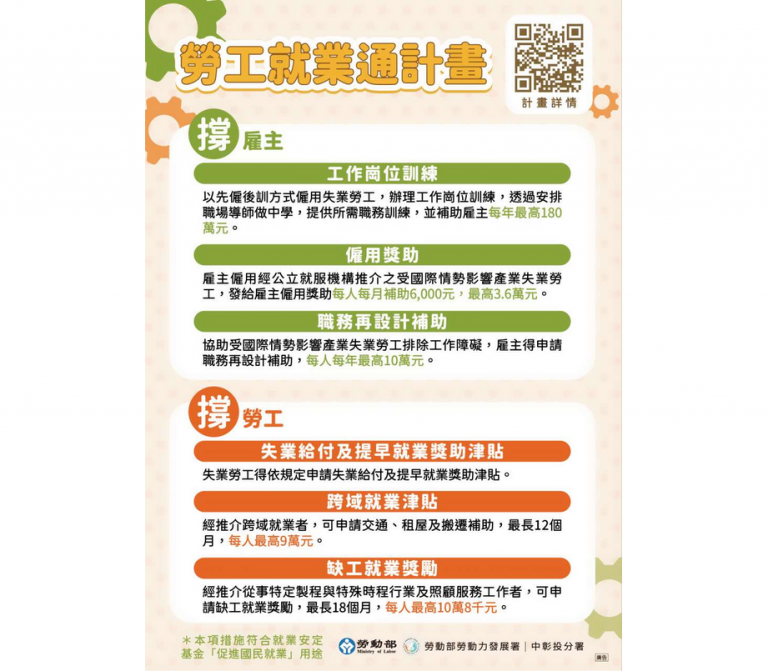 除僱用獎助外,勞工就業通計畫依不同失業勞工的個人需求,另有提供企業「先僱後訓」的工作崗位訓練機制,由企業安排職場導師協助補強必要技能,勞動部則補助雇主每人每月12,000元、最長3個月訓練經費。若員工遭遇工作障礙,就業中心也可提供「職務再設計」服務,每名勞工年度最高可補助雇主10萬元,用於改善設備、提供就業輔具、或調整工作方法等項目。想瞭解更多計畫細節,可至台灣就業通網站「勞工就業通專區」查詢,或洽詢各地公立就業中心了解更多資訊,也可撥打0800-777888免付費諮詢專線。