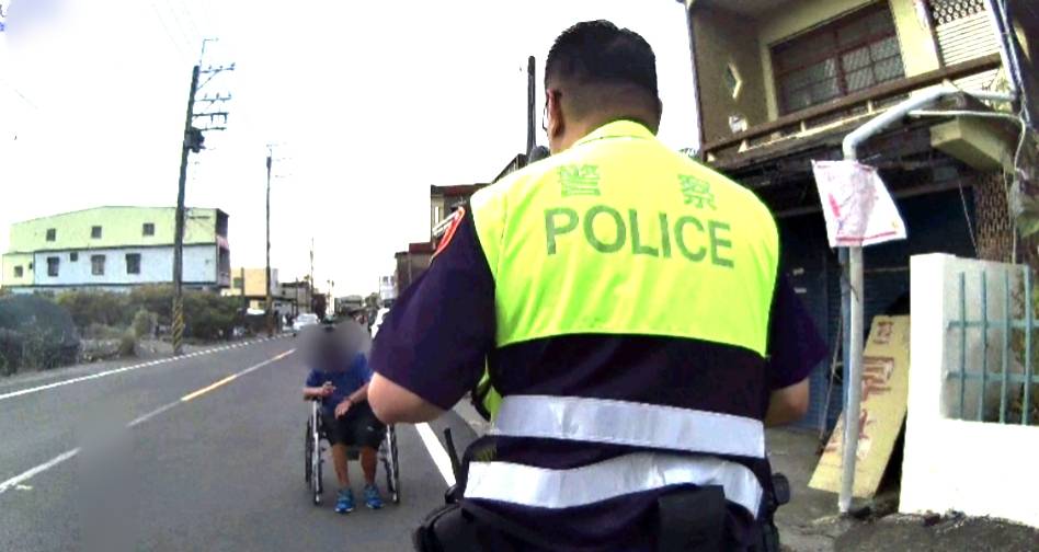 鄭姓老翁(47年次) 行動不便,平日以輪椅代步,獨自坐輪椅往田厝村成功路上返家途中,獨自推輪椅非常緩慢,正逢車流量較大之時段,因老翁行駛輪椅緩慢停在路中央,員警深怕老翁恐遭後方車輛追撞,立即上前推動輪椅協助老翁過馬路,老翁對員警的協助表示感激。