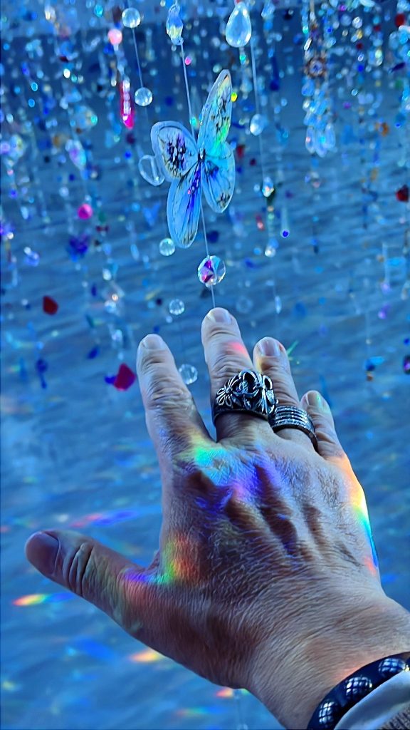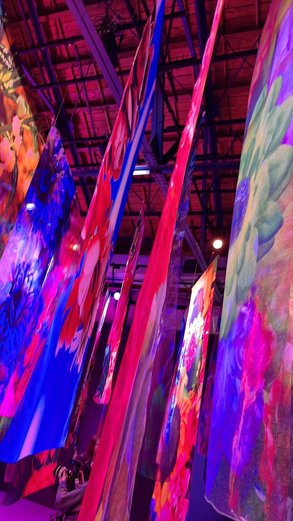 終場,站在近兩千條串接著愛心、蝴蝶、眼睛與花朵的霓虹水晶簾幕中,原本會凋謝的花,被轉化為一種跨越現實的幻境。似乎也在叩問:如果美麗可以透過科技與藝術永存,那麼從繁花似錦中被抽離出來的「凋零」,是否才是最接近生命本質的時刻?