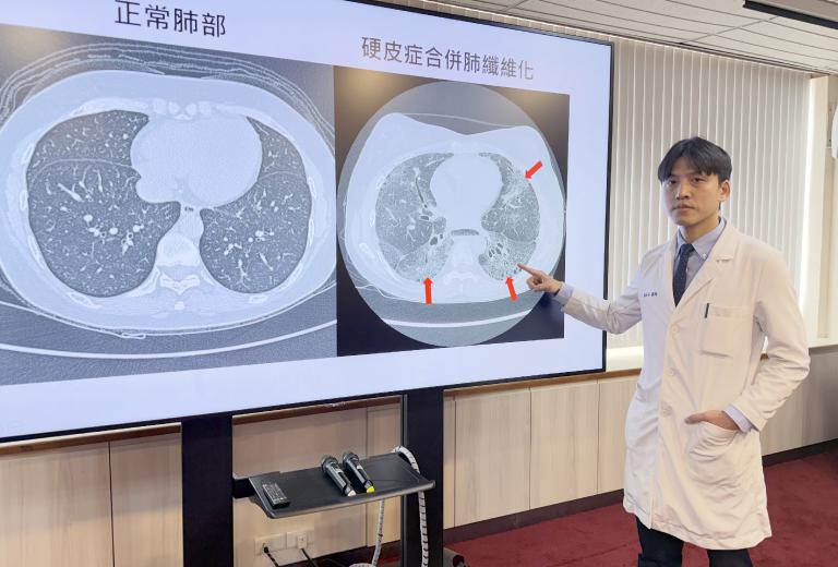 ▲臺中榮總過敏免疫風濕科醫師顏在弘說明,肺纖維化是全身性硬化症嚴重的併發症。中榮研究發現,透過抗體檢測可預測高風險族群。(圖╱台中榮總提供)