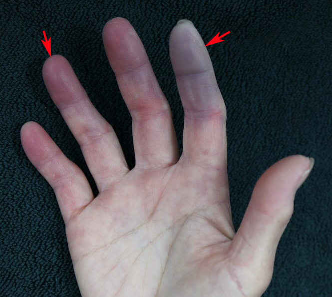 ▲全身硬化症初期症狀是在天冷或接觸冰冷物品時,手指會變紅、變紫(箭頭指處)或變白,提醒民眾若出現類似症狀,應儘早就醫檢查。(圖╱台中榮總提供)