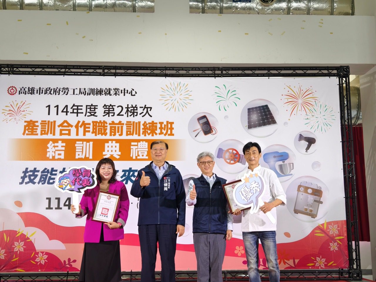 高市勞工局產訓合作訓練班於今(30)日舉辦結訓典禮,共計137位學員順利學成結訓,典禮以「技能扎根,未來啟動」為主題,意喻學員經過4個月的學習磨練,習得一技專長,讓技能成為未來的發電機,在職場上重新啟動,綻放自我光彩。江健興局長恭喜學員們即將展翅迎接職涯新旅程,期許面對未來新的職涯階段,要相信自己的能力,不要害怕挑戰和困難。江局長表示,受訓期間透過每天累積的努力與進步,就是在為技能扎根打基礎,讓未來可以更穩、更有力量。現今職場環境變化快速,而在產訓班學到的,不只是一項技能,還包括面對變化與困難的勇氣及韌性,勉勵學員持續學習,不論是就業、轉職、創業,甚至跨領域發展,都能以今天的成果為起點,勇敢去挑戰、去實踐未來的夢想與目標。