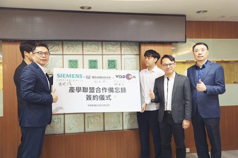 ▲西門子公司董事長陳晧璋(左二),睿志科技總經理林建信(右二)、高科大副校長郭俊賢(右一)簽署合作備忘錄。(圖/高科大提供)