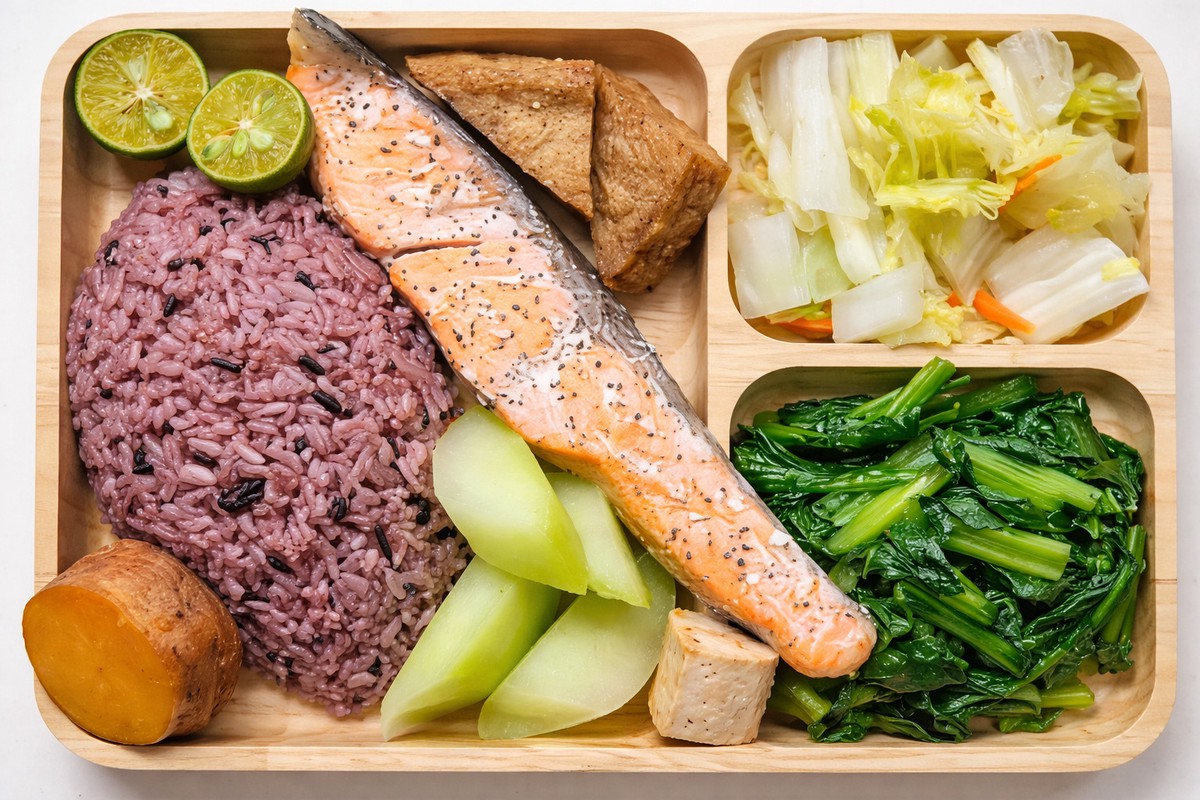 餐盒以高蛋白、低油鹽為原則,包含燜煮雞胸、滷雞腿、爐烤鱸魚等選擇,搭配紫米飯、蒸地瓜與時蔬,是常見的新莊低負擔餐盒首選。