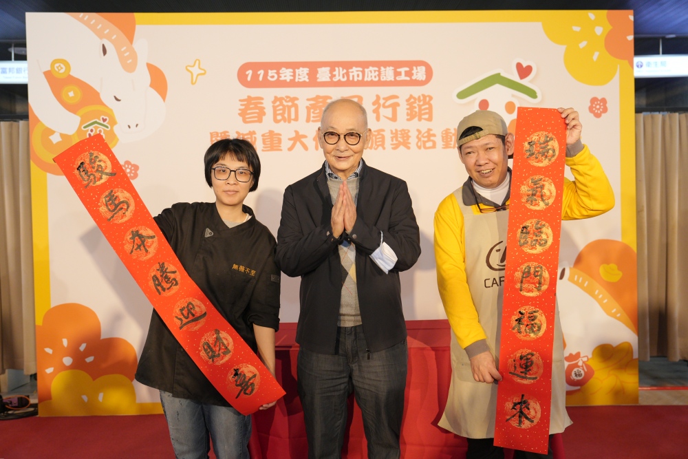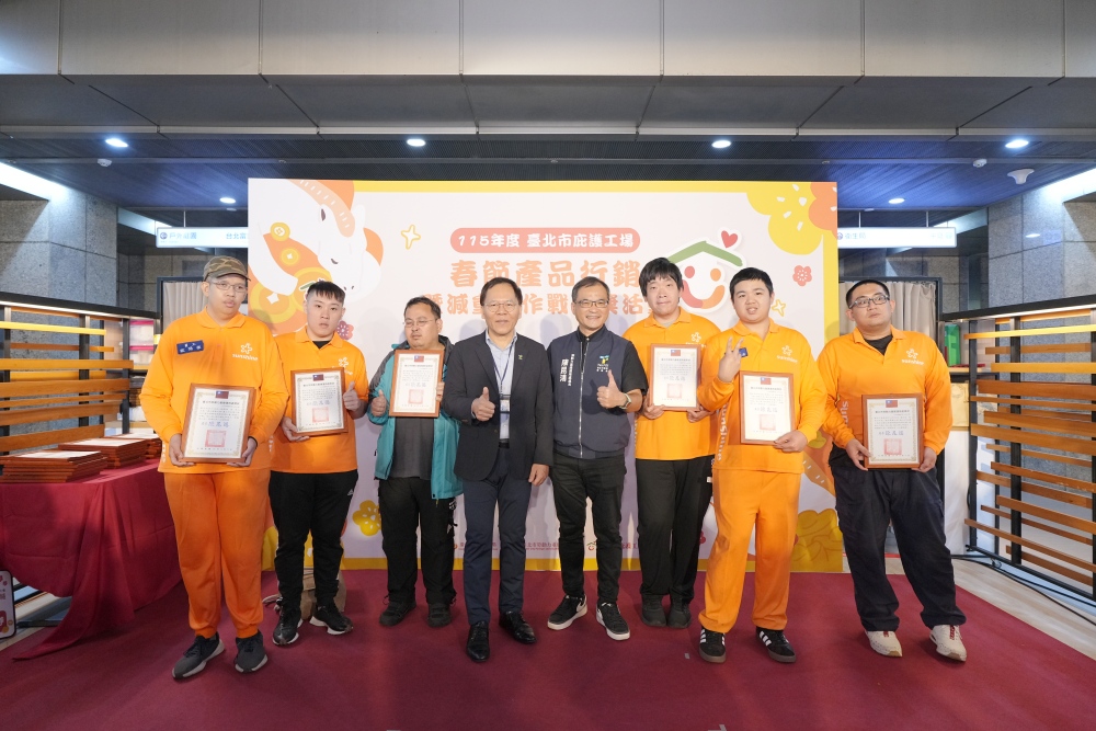 重建處12月23日在臺北市市政大樓1樓ENJOY臺北餐廳舉辦「115年度臺北市庇護工場春節產品行銷暨減重大作戰頒獎活動」,現場除展示庇護工場豐富且多元的春節禮盒及產品,同時進行身障夥伴們「減重大作戰」成果頒獎,並邀請10組庇護職人、網紅藝人登台走秀,包含:關韶文、銘銘就、周露露、靖雯、陳 The Chen、林美貞、林義傑等7位知名人物。
