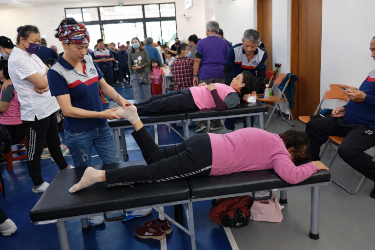 803國軍臺中總醫院與高堂中醫聯合診所,也在現場提供完整的基礎健檢,包括血壓量測、體重與BMI評估、血糖與膽固醇等抽血篩檢,以及中醫把脈與簡易推拿服務。現場也由醫護與中醫師提供專業衛教與健康諮詢及理髮師現場義剪等活動,協助民眾瞭解自身健康風險,並給予後續照護建議。對於行動不便或平時缺乏就醫資源的長者而言,這次健檢能有效彌補醫療取得不足的問題。