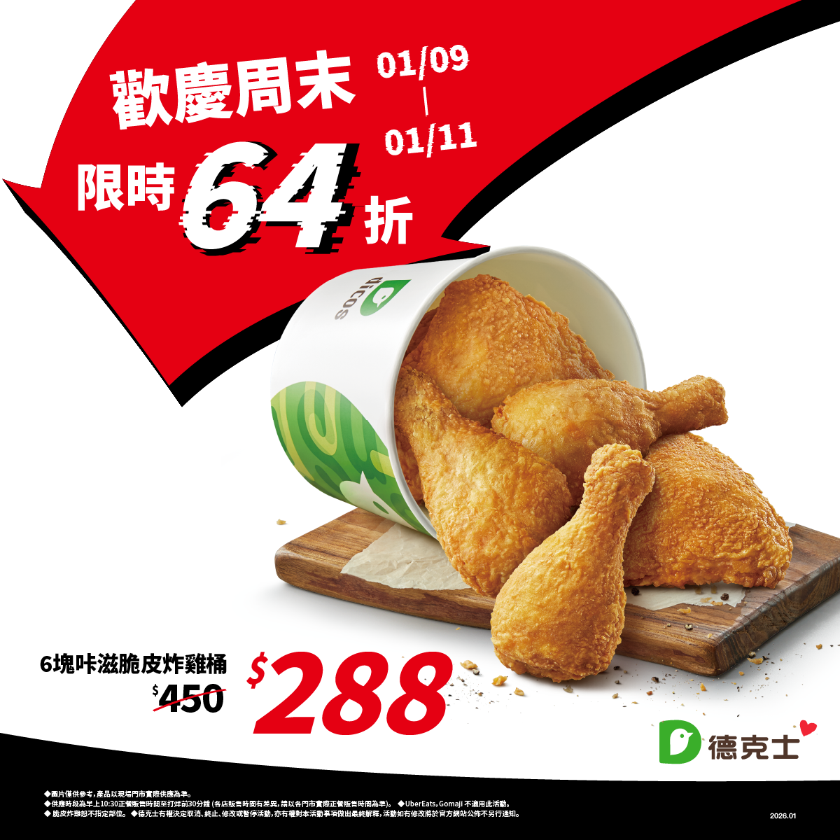 ●  週末限定優惠,整桶通通都是腿,嚴選台灣本土雞製作,限時三天下殺 64 折,全台門市同步販售,數量有限,售完為止。