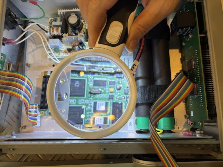受美國關稅影響而遭資遣的劉先生於2025年12月入職成悅科技,主要負責各類精密儀器維修與檢測,由於不同機具的構造差異極大,作業時需處理小於1mm的微小電子元件,劉先生在長時間的高精度檢測下,容易產生視覺疲勞,且在面對不可拆卸的大型機組時,常須深入機台內部昏暗的死角進行維修,受限於空間與傳統照明,工作上面臨極大的技術挑戰與環境限制。