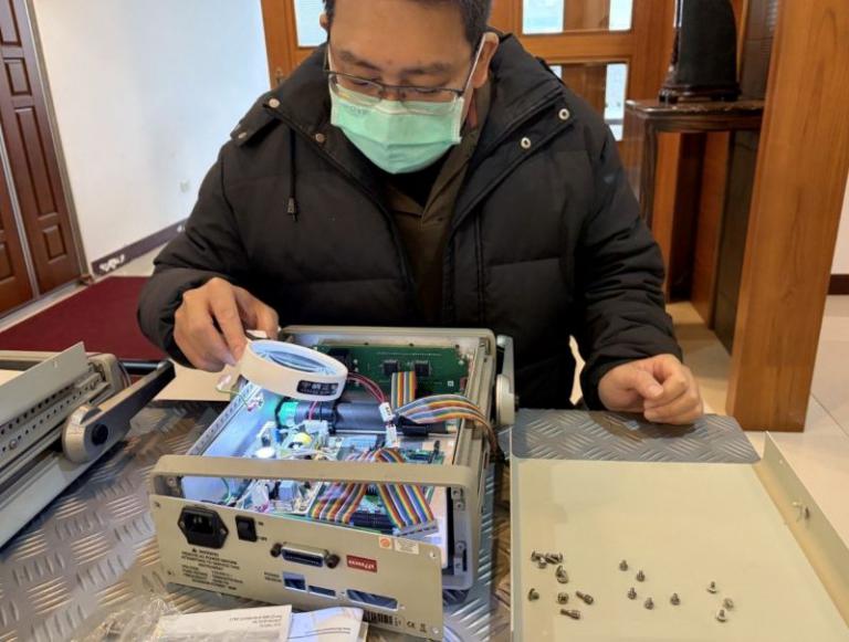 ▲劉先生運用「專業頭燈」就業輔具,即使進行微細零件檢修與暗處作業,也能從容應對。(圖/記者蔣彤雲攝)