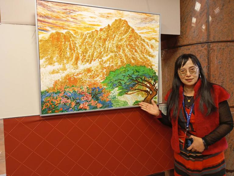 ▲建國科大美術館林育如秘書也是畫會成員,這次展「玉山」及「年年有餘」兩件作品。(圖╱記者孔亮云攝)