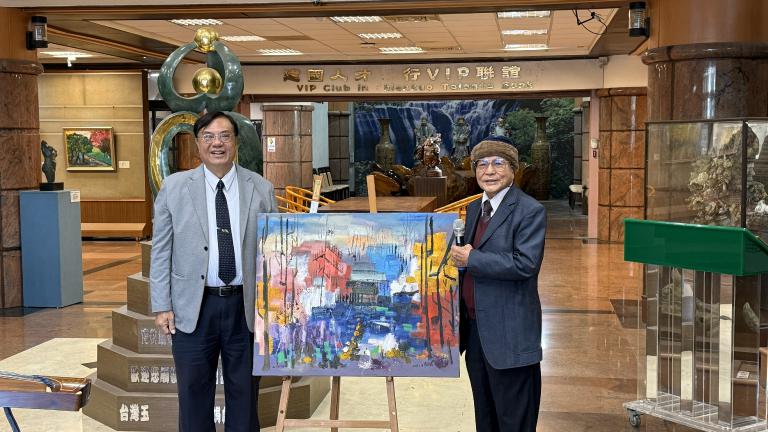 ▲台中市油畫家協會理事長李賜鎮(右)慷慨捐贈他的作品〈春吟〉予建國科大典藏,象徵藝術精神的延續與教育文化的深耕,江金山校長代表接受。(圖╱記者孔亮云翻攝)