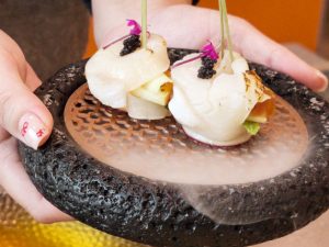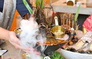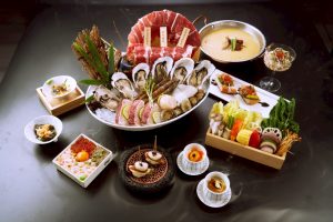 《海港匠鍋》店內主打的「雙人珍饌御膳」套餐,從前菜到甜點層層鋪陳—極品小堡貝、蟹膏茶碗蒸與酥脆牛蒡手卷等各式不同精緻前菜揭開序幕,口感細膩與酥香交錯;刺身拼盤與鮭魚卵山藥細麵展現當日漁獲鮮度,日本生蠔海鮮盤更將「鮮活現流」直接端上桌,成為視覺與味蕾焦點。