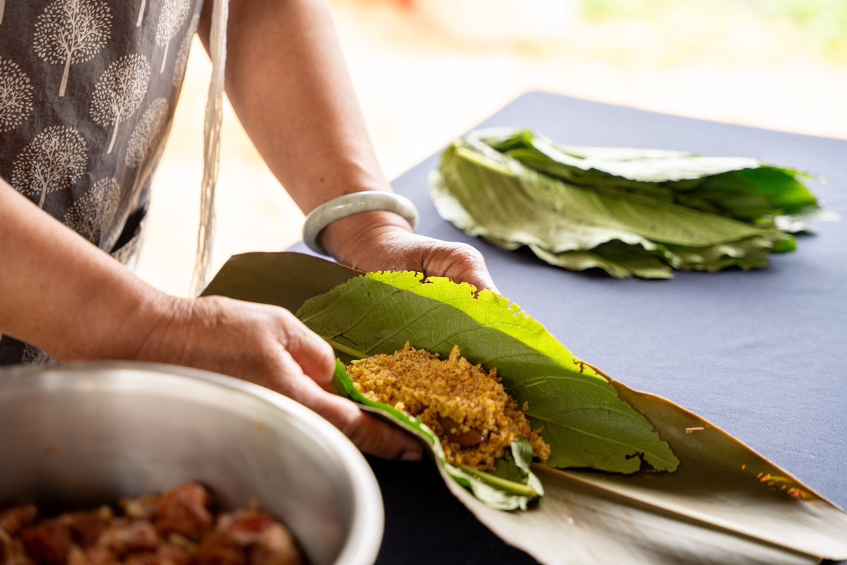 活動現場由部落長者與族人親自示範,從備料、填裝到綁繩,每一個步驟都蘊含著代代相傳的生活智慧。民眾圍坐一堂,在族人的引導下學習製作傳統「吉拿富」,將紅藜、小米與在地食材包入葉中,不僅體驗手作樂趣,也更深入理解原住民族飲食文化的內涵。