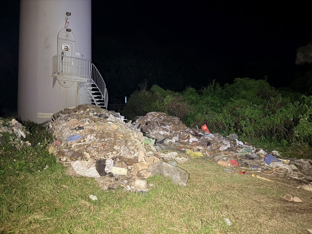 竹南警察分局大同派出所3月11日深夜巡邏巡經竹南鎮新崎頂段(3號風力發電機下方)時,發現一輛曳引車正在傾倒廢棄物,駕駛見巡邏車到場後立即棄車逃逸。警方隨即封鎖現場並通知環保局到場勘查,經認定現場棄置物為事業廢棄物約70噸,已涉嫌違反《廢棄物清理法》。