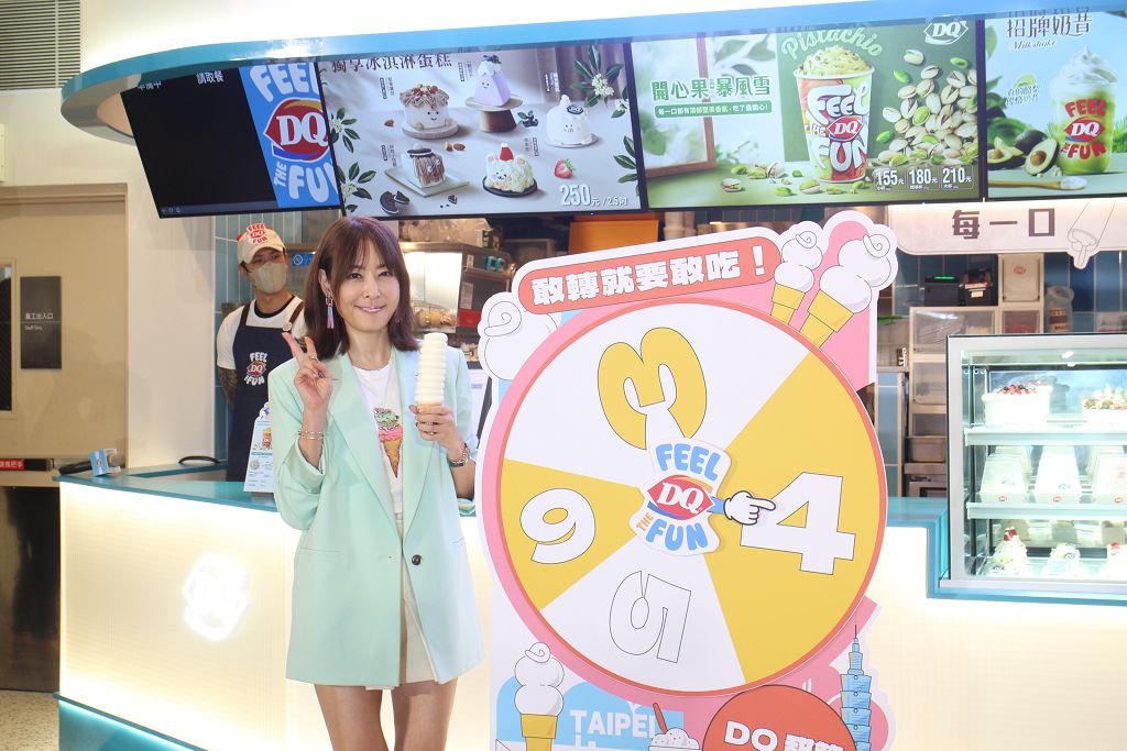 DQ 於開幕首週推出幸運轉盤挑戰,購買雙球甜筒便可參與一次,最多有機會不加價升級成 10 球甜筒。台北 101 董事長賈永婕代表全台消費者搶先挑戰。(圖/柯宗鑫攝)