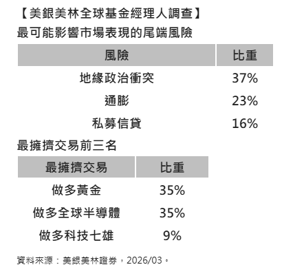 根據彭博資訊等外電新聞援引,3月美銀美林經理人調查報告顯示,受伊朗戰事與私募信貸疑慮影響,投資人原本極度的樂觀情緒被拉回至悲觀情緒,對全球經濟前景的樂觀預期降溫,現金水位大幅攀升。