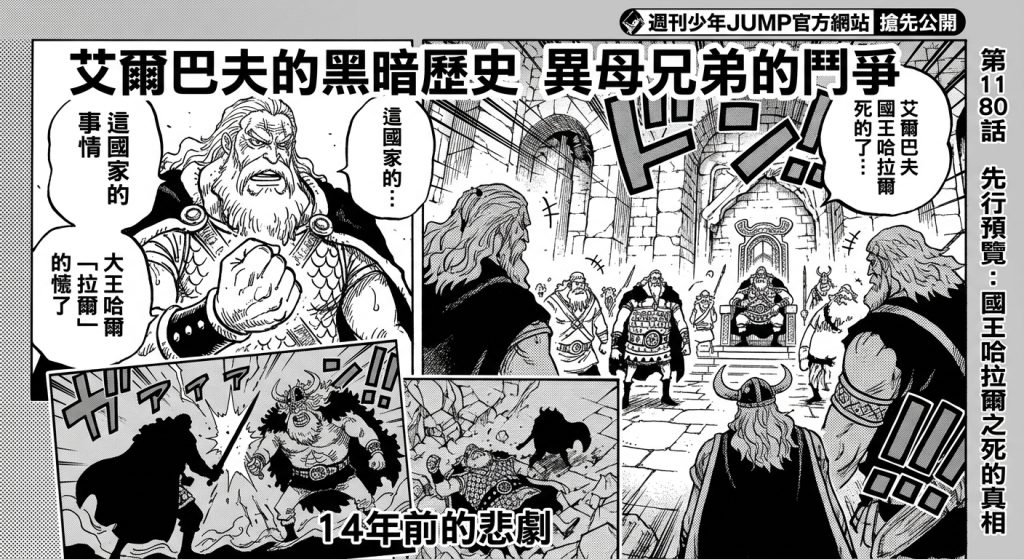 先行圖中也展現出不穩氣氛,洛基王子正遭到神之騎士團成員的殘酷對待。面對世界政府提出的「加入神之騎士團、升格為天龍人」的誘惑,洛基王子展現出頑強的意志並斷然拒絕。與此同時,魯夫、索隆、娜美一行人潛入荒廢多年的古堡,並發現大量巨人戰士的殘骸,驚覺艾爾巴夫早已淪為各方勢力博弈的危險戰場。
