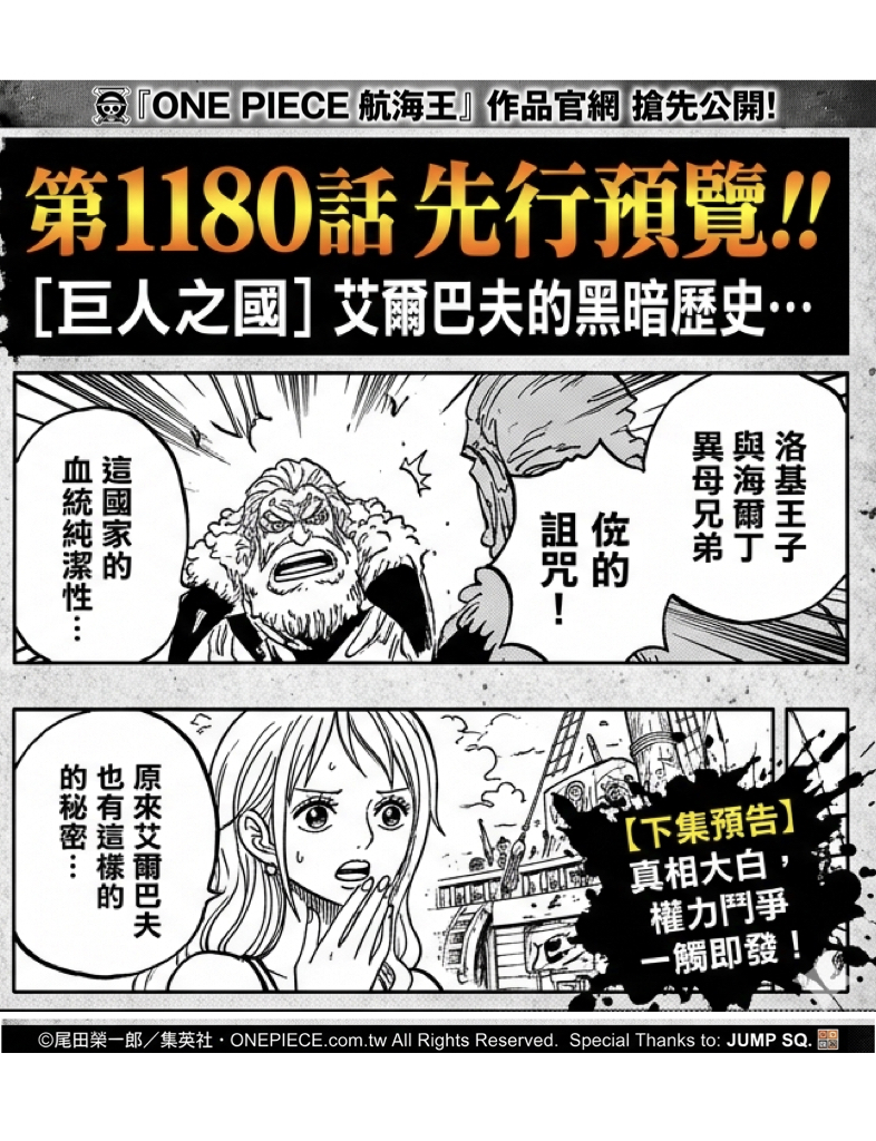 《航海王》第 1180 話的完整內容,正式在《週刊少年Jump》雜誌刊載。隨著魯夫一行人深入巨人之國的核心,與「神之騎士團」的正面交鋒似乎已不可避免。這場涉及古老血統、世界政局與海賊夢想的終極衝突,再次刷新讀者對「偉大航路」的想像。