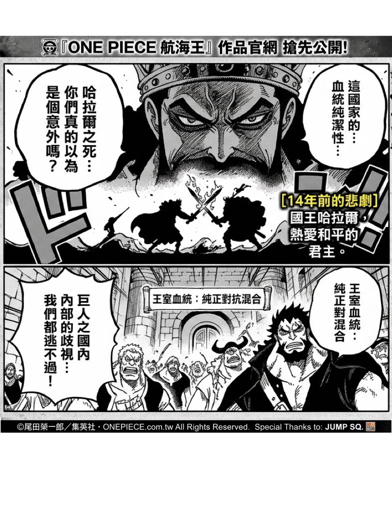 文/JO HSU《ONE PIECE 航海王》作品官網公開最新(第 1180 話)的先行預覽頁面,僅有一頁的內容憑藉著不尋常的台詞與緊繃的氛圍,已在社群媒體上引發海嘯般的考察潮,預告著冒險進入下一個高潮衝突。 神之騎士團領導者「夏姆洛克」正式登場? 根據先行公開內容及相關情報顯示,本話聚焦在神秘組織「神之騎士團」。最令人震驚的焦點在於神之騎士團司令官—費加蘭德·夏姆洛克(Figarland Shamrock)真面目的揭曉。夏姆洛克身為費加蘭德·加林聖之子,外型與紅髮香吉士極為相似,其出現在「艾爾巴夫」地下世界的動向,預示世界政府企圖強行併吞巨人之國的野心。 巨人族內部權力鬥爭 國王哈拉爾之死的真相 劇情深入探索巨人之國「艾爾巴夫」的黑暗歷史。先行頁面提到的「這國家的…」台詞,被認為與 14 年前哈拉爾王(King Harald)之死的真相有關。哈拉爾王曾是一位熱愛和平的君主,卻在多年前與洛基王子的激烈戰鬥後喪命。洛基王子與海爾丁之間錯綜複雜的異母兄弟關係,以及巨人族內部對血統純正性的歧視,都將在本話中進一步揭露。 獵人與獵物 洛基王子拒絕「神格化」 先行圖中也展現出不穩氣氛,洛基王子正遭到神之騎士團成員的殘酷對待。面對世界政府提出的「加入神之騎士團、升格為天龍人」的誘惑,洛基王子展現出頑強的意志並斷然拒絕。與此同時,魯夫、索隆、娜美一行人潛入荒廢多年的古堡,並發現大量巨人戰士的殘骸,驚覺艾爾巴夫早已淪為各方勢力博弈的危險戰場。 《週刊少年Jump》揭曉全貌 《航海王》第 1180 話的完整內容,正式在《週刊少年Jump》雜誌刊載。隨著魯夫一行人深入巨人之國的核心,與「神之騎士團」的正面交鋒似乎已不可避免。這場涉及古老血統、世界政局與海賊夢想的終極衝突,再次刷新讀者對「偉大航路」的想像。 Please enable JavaScript to view the comments powered by Disqus.