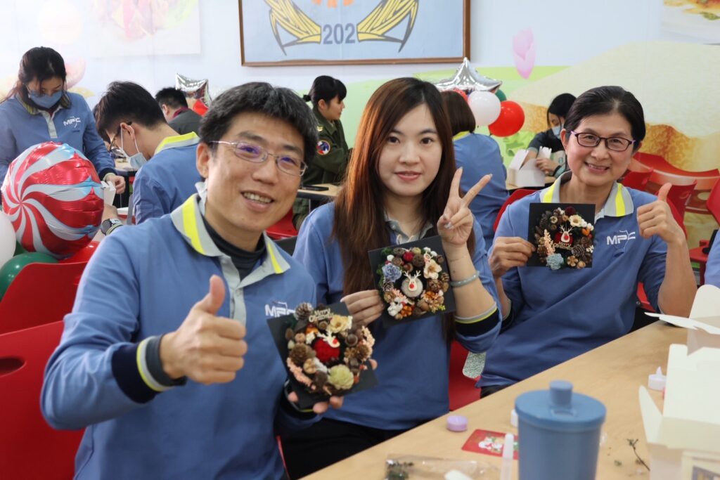活動中由國際園藝治療師林靜君老師教導與會人員利用諾貝松、乾燥花材、香氛蠟燭和聖誕節慶飾品,親手製作專屬於個人風格的聖誕花圈,不僅讓大家體驗製作過程的心得及喜悅,並享受完成時的成就感,讓大家能舒緩壓力,專注感受植物的自然藝術之美。完成手作耶誕花圈活動後,江主任轉往營區內的職場互助教保服務中心與就學小朋友同樂。