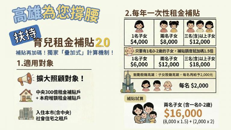 同時,市府將「育兒租金補貼」升級為2.0版本,適用對象涵蓋中央及地方興建社宅住戶、中央核定租金補貼戶,以及高雄市增額租金補貼對象,預計可照顧12,560戶育兒租屋家庭。透過擴大涵蓋範圍及提高補貼權重,期盼有效減輕育兒家庭在居住與照顧上的經濟壓力,並優先引導入住功能完善的社會住宅。