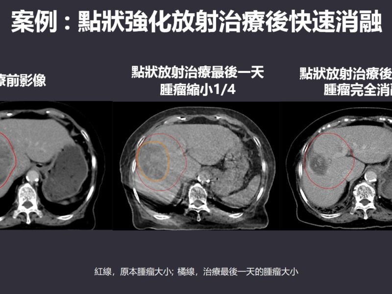 針對體積較大的腫瘤,高雄榮總採用空間分割放射治療(SFRT)技術,在同一腫瘤中設計高、低劑量分布。林醫師分享一例90多歲高齡肝癌病患,腫瘤體積達460立方公分如中型葡萄柚大小,透過空間分割放療將高劑量鎖定腫瘤核心、低劑量包覆周邊,並搭配免疫治療。治療後僅兩週腫瘤明顯縮小,四個月後幾乎消失,病患追蹤情況良好。