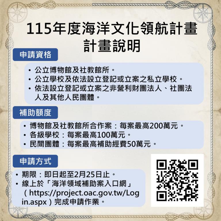 115年度海洋文化領航計畫徵件對象為各級學校、民間團體及博物館、社教館所,自即日起至115年2月25日止受理申請。本年度採線上申請方式,申請單位須至海洋委員會「海洋領域補助案入口網」(https://project.oac.gov.tw/Login.aspx)完成填報作業,並上傳相關計畫書及證明文件。本年度學校單位每案最高補助新臺幣100萬元,民間團體每案最高補助50萬元,公立博物館及社教館所每案合作經費最高為200萬元,期望透過各界參與,實現不同規模與型態的文化行動。