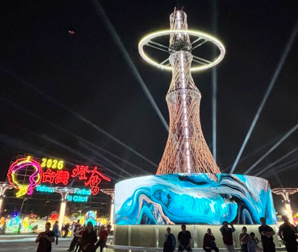 2026台灣燈會「光躍台灣・點亮嘉義」在嘉義縣政府前廣場盛大登場。現場焦點主燈高達21公尺,名為「光沐-世界的阿里山」,外部結構採循環木料打造,融合太陽、水霧與神木意象,透過聲光影像展演,將台灣島嶼故事搬上夜空,令人耳目一新。