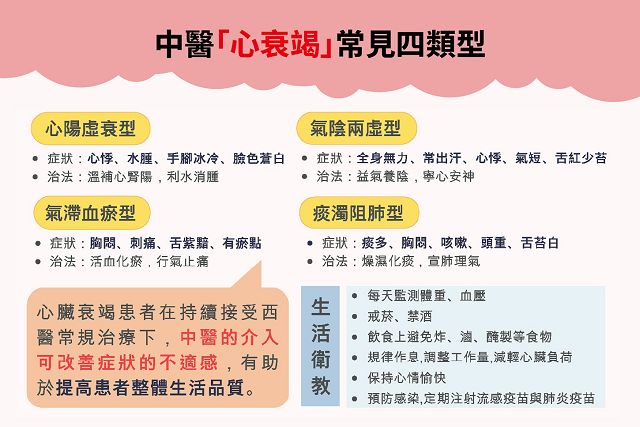 中醫部副主任陳運泰醫師說明,中醫在心衰竭治療中扮演的是優化治療效果的角色,重點在於整體調理與支持身體功能,例如提升體力、改善疲勞與呼吸困難,協助患者在長期治療中維持較佳生活狀態。近年也已有國際研究證實,在標準西醫治療基礎上加入中醫藥輔助,能降低心衰竭惡化住院或心血管死亡風險,且具良好安全性,顯示中西醫整合在心衰竭照護上有一定的價值。中醫將心衰竭常見證型歸納如下:心陽虛衰型、氣陰兩虛型、氣滯血瘀型、痰濁阻肺型。中醫藥治療強調整體觀與辨證論治,依不同體質與症候型態,提供個別化調理方案,作為現代醫療的重要輔助。多項研究也支持將八段錦或太極拳等傳統養生運動納入心衰竭病人的心肺訓練計畫中。這類溫和的養生運動有助改善呼吸困難、肌耐力與心理狀態,非常適合慢性心衰竭病人長期練習,是極佳的自我保養方式。