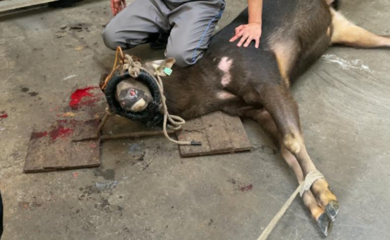 PETA 調查員今年前往台灣某處鹿場,紀錄下多段令人不忍直視的畫面。部分水鹿已出現皮膚病症狀,而在採集鹿茸過程中,工作人員以繩索強行綁住公鹿的兩隻前腳與一隻後腳,再將其拉開固定。鹿隨即被按壓在地,鹿茸遭粗暴鋸斷,過程中鮮血四濺。影片可見,公鹿不斷掙扎,明顯呈現極度痛苦、恐懼與壓力。
