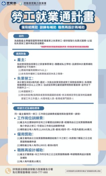 ▲桃竹苗分署表示,「勞工就業通計畫」提供工作崗位訓練費、僱用獎助及職務再設計補助三大核心措施,以加強勞動市場韌性並穩定國內就業環境。(圖/桃竹苗分署提供)