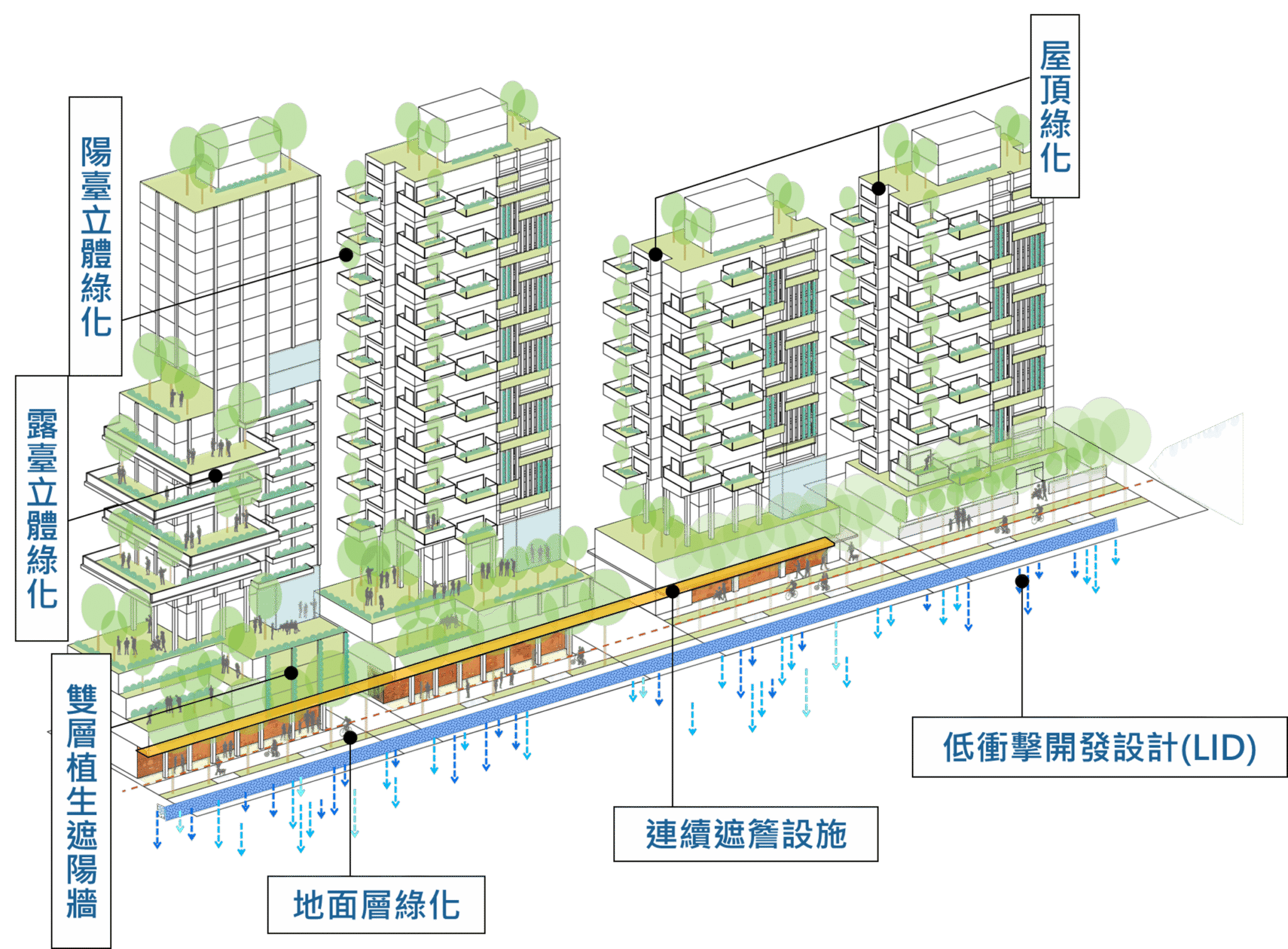 114年7月新修訂之綠化實施規則,首創導入「綠容率」、「等效綠覆面積」及立體綠化等規定,強化植栽遮蔭與建築節能。[圖片建管處提供]