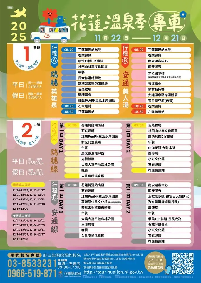 溫泉專車行程亦於114 年11月22日至12月21日同步啟動,提供一日遊與二日遊兩種選擇。一日遊包含瑞穗與安通兩條路線,每日自花蓮轉運站出發,八人成行,平日750元、假日850元,費用包含午餐、泡湯、隨車導覽、伴手禮與保險,行程豐富、輕鬆超值。二日遊則結合花蓮中南區文化景點與溫泉體驗,十二人成行、兩人一室,平日每人3,500元、假日4,200元,是深入探索花蓮南區自然風貌與文化底蘊的最佳選擇。